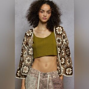POL Floral Granny Square Crochet Cardigan Retro Boxy Open Front Sweater Openwork