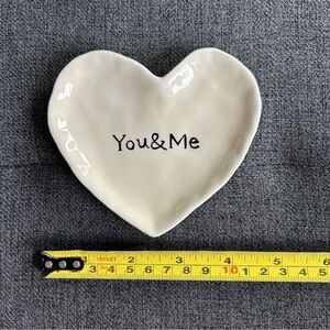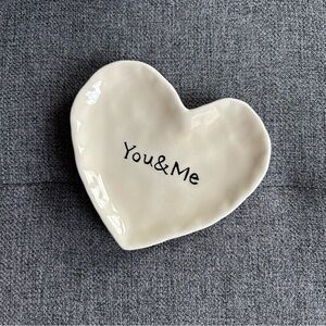 Sweet little trinket or jewelry dish! Fun heart shape in a slightly hammered, bubbly appearance (similar to Rae Dunn) with โYou & Meโ in black script on the front. Perfect for your dresser, nightstand, or the bath / kitchen to hold rings while showering or doing dishes, etc. Nice wedding present, too! Just cuteness! ๐โฅ๏ธ