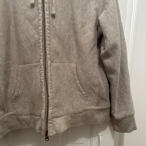 Details: Soft tan, cream colored fleece with cozy texture. Zip-up and drawstring. Sherpa hoodie. Ideal for layering and staying cozy on the sofa this winter!