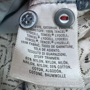 Keywords: Denim shirt, Chambray shirt, Lace trim, Ruffle hem, Button up, Long sleeve, Casual, Boho, Western, Shabby chic, Feminine, Lightweight, Apparel