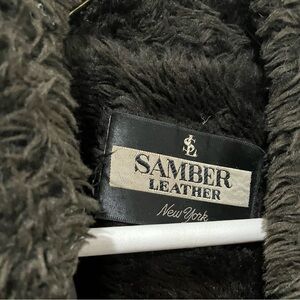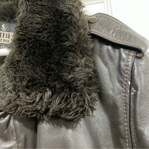 Elevate your style with the Men's Brown Leather Bomber Jacket. Fits like a medium. In excellent shape with a small blemish shown in photo. Crafted for comfort and durability, this jacket features a rich brown color and a plush collar for added warmth. Perfect for any occasion.