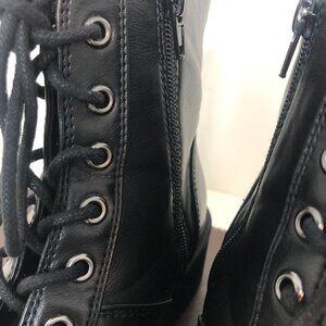 These trendy Guess combat boots. These feature a durable black faux-leather construction and a stylish white vertical logo print on the side. Perfect for a moto or grunge look.
