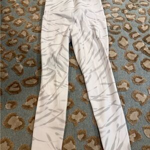 Cream tights with gray abstract design. Features stash pocket. Ideal for workouts. Small spot on front, slight wear on back. Still in great, pre-loved condition.