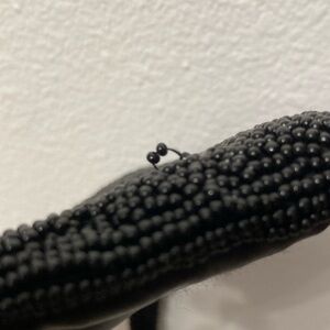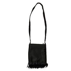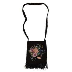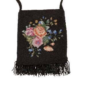 Vintage Hillard & Hanson floral beaded shoulder bag / tapestry bag. Super cute floral rose design with black beading. Beaded fringe. Giving whimsygoth vibes. A couple small marks on the back (pictured) and a small pull on the beading (pictured), otherwise in good condition with no rips or holes.