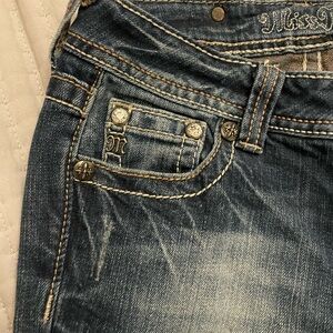 Stylish boot cut jeans by Miss Me. Features classic blue denim. Perfect for casual wear.
