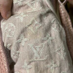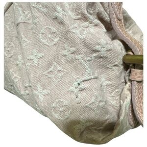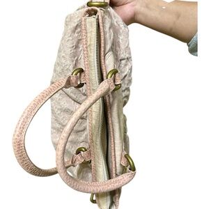 Authentic Louis Vuitton Mini Lin canvas satchel handbag in a soft pink/blush color with leather trim and gold-tone hardware. Features the iconic woven LV monogram canvas, double rolled leather handles, side strap details, and a top zip closure.