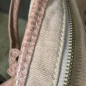 • Leather trim shows creasing, dryness, cracking, and wear, especially on handles and strap attachments