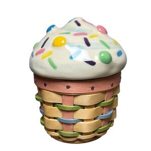 This is a beautiful and collectible Vintage Longaberger 2006 Collectors Club Little Cupcake Basket set. This limited edition set was released to celebrate the 10-year anniversary of the Collectors Club. The basket is handwoven from hardwood maple splints with soft pink, soft aqua, and light green accent weaves. The lid is hand-painted stoneware designed to look like frosting with colorful sprinkles. Both the basket and the ceramic lid were made in the U.S.A. Has the original box and protector.