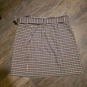 NWT Club Monaco Houndstooth Mini Skirt, size 14. Brand new with tags. Features a classic black, white, and subtle pink/rose (Taupe Pink Mix) houndstooth pattern with a stylish self-tie belt detail at the waist. This A-line mini skirt is perfect for a chic and polished look, easily dressed up or down. Original retail price: $158. Perfect for office wear, casual outings, or a night out. High-quality Club Monaco design.