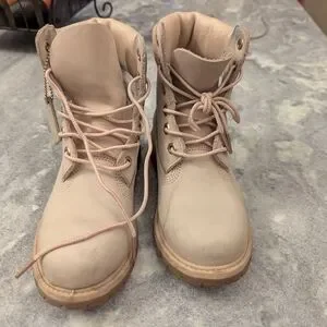 Step out in style with these beige Timberland boots. Perfect for any casual outing, these boots offer both comfort and durability.