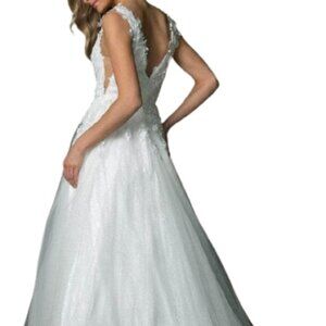 This elegant white lace gown is perfect for special occasions. Its intricate design and flowing silhouette offer a timeless look.