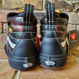 High-top Vans sneakers with a bold black and camouflage pattern. Features durable construction and stylish design.