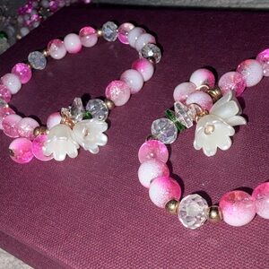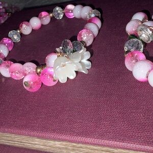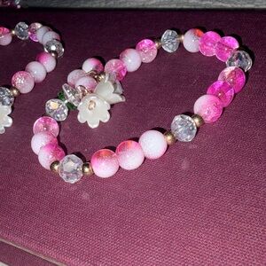 Elegant pink and white beaded bracelet set, perfect for adding a touch of color to any outfit. Featuring a lily charm