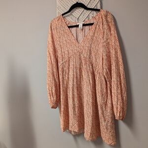 H&M Orange Cream Patterned Long Sleeve Baby doll V Neck Dress Medium