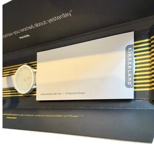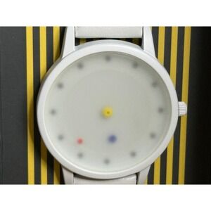 Kikkerland Reductous Watch designed by Milton Glaser. This unique timepiece is rare and out of production. It features a minimalist face with gray dots and colorful dots in yellow, red and blue indicating the time. The watch includes a clean white band and comes presented in its original packaging, which also showcases inspirational quotes.