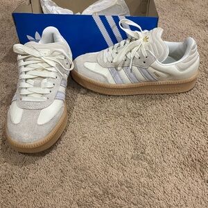 Adidas Samba sneakers in cream with brown soles. Features signature stripes and gold accents. 6 1/2 kids but fit a 7 1/2 in women’s. NEW worn once. No flaws