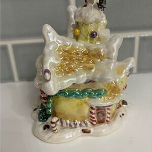 Charming ceramic house with Santa. Features festive red and green details. Perfect for holiday decor.