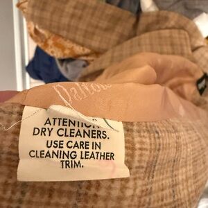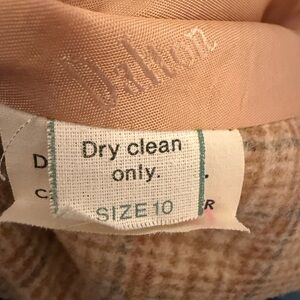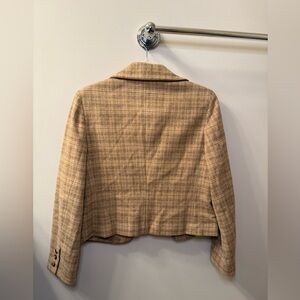 Beautiful vintage late-1990s / early-2000s (Y2K era) cropped blazer by Dalton, crafted in a classic camel and tan plaid wool-blend tweed with genuine leather trim along the lapels for a refined, elevated finish.