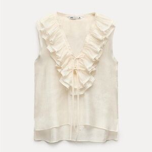Chic cream blouse with ruffled neckline. Lightweight and stylish. Perfect for versatile wear.