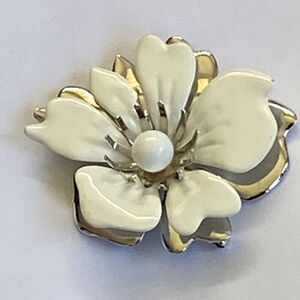 Sarah Coventry Vintage 1980s Enamel Flower Brooch White Silver Gala FancyGrandma