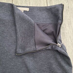 Sleek charcoal gray women's pencil skirt with a smooth stretch knit feel, fully lined interior, clean tailored silhouette, and hidden back zipper perfect for work or polished everyday wear, size 0