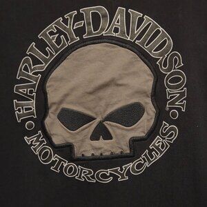 This is a long-sleeved Harley Davidson shirt with a skull on the left breast on the front and a large skull on the back. The skulls are embroidered and stick up a little. Harley Davidson is also on both sleeves in large letters from just below the shoulder to the wrist.