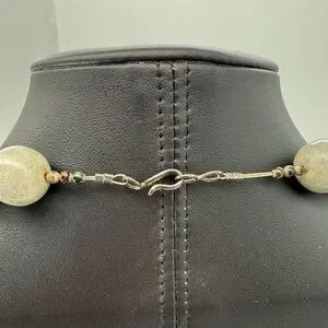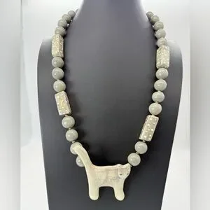 Each element displays natural variations consistent with artisan craftsmanship, making this a one-of-a-kind wearable art necklace. Earthy neutral tones with a whimsical yet refined aesthetic. Finished with a hook-style clasp.