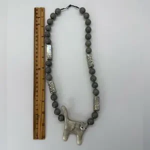 Details: Handmade artisan necklace; ceramic cat pendant; hand-painted clay beads; metal findings; hook clasp; measurements shown in photos.