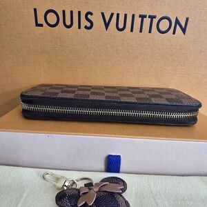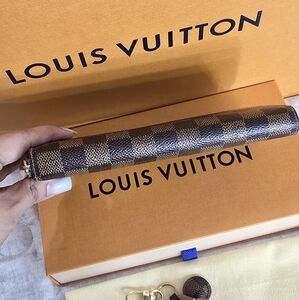 Elegant Louis Vuitton wallet in a classic checkered design. Features a rich brown color, perfect for any occasion.