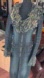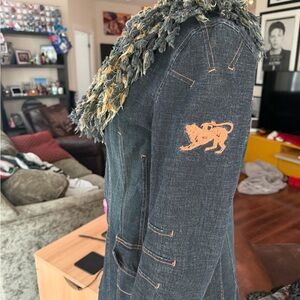 Stylish vintage blue/ black denim coat with fringe details. Features a zip closure and front pockets.