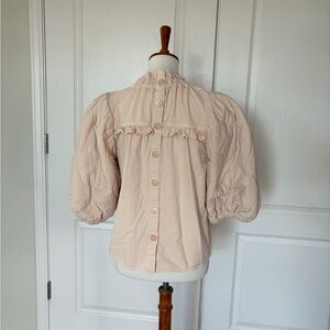 Chic blouse with quilted puff sleeves. Features ruffle mock neck. Button back. Ideal for stylish outings. Cotton. Very good condition.