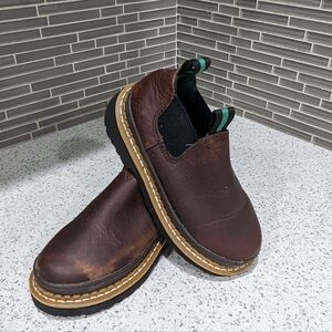 The upper of this Little Georgia Giant kids' Romeo is durable and smooth leather. The rubber bumper guard protects these round-toe shoes from abrasions. An elastic gore on each side of the opening provides slip-on convenience.