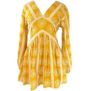 🔆 Free People, Harni Alexia Yellow Long Sleeve Mini Dress, Size Medium US 8