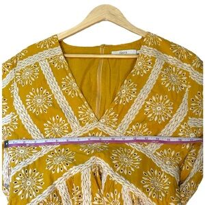 Brighten your wardrobe with this stunning yellow fully embroidered floral dress. Perfect for any occasion, this dress combines style and comfort effortlessly. Embroidered and eyelet detailed mini dress w/ v-neckline and back zipper detail. Medium / Size US 8