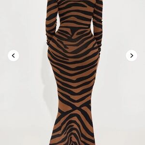 Stylish maxi dress with zebra print. Long sleeves. Perfect for any occasion. This is a great dress for an evening out. The style is very low cut. it will reveal a lot of cleavage. The sleeves are long with a nice bevell going to the hands a great elegant look