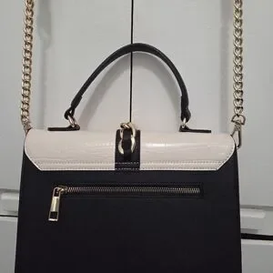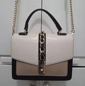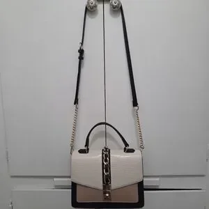 Chic crossbody bag with black, cream, and tan panels. Gold chain detail adds elegance. Perfect for versatile styling.
