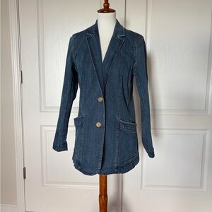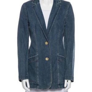 Sophisticated denim blazer with notched lapels and two-button front closure. Features front patch pockets and tailored silhouette. Premium denim construction offers polished yet casual appeal. Very good condition.