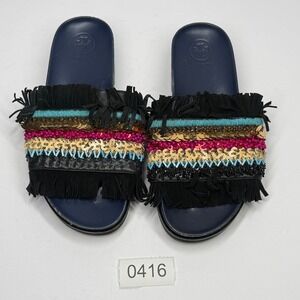 Tory Burch Isle Slide Sandals Embellished Fringe Black Leather Size 6.5M