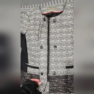 Great condition. Size 8. Black white and cream in color. 2 front pockets. Button and zipper closure. Measurements and fabric content listed above in pictures.