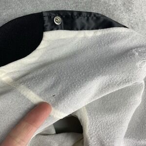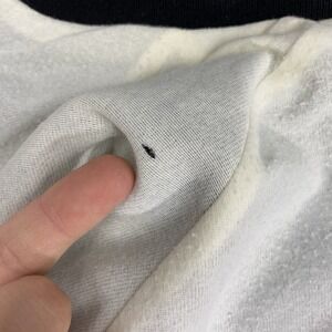 A few minor runs in the fabric. A couple of small holes in the lining. Cracking to the graphic. See photos.