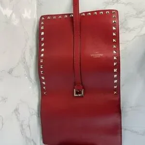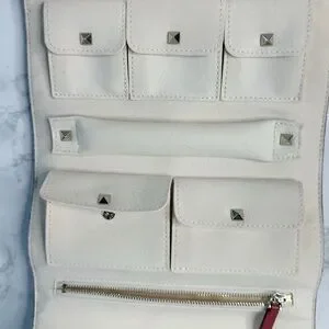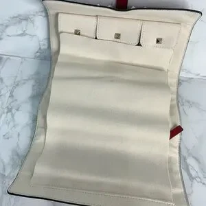 Elegant red jewelry travel clutch case with signature silver studs. Features a sleek buckle closure. Comes with original packaging and accessories. Like new and no signs of wear.