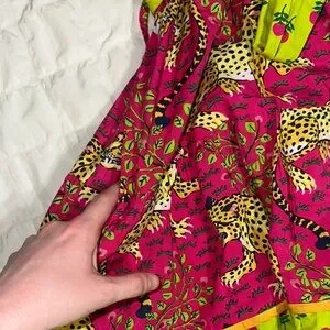 Vibrant dress with bold leopard print. Features pink and green hues. Perfect for casual outings.