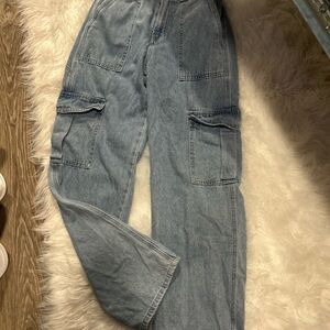 Trendy, stylish light blue cargo jeans with multiple pockets. Perfect for casual wear. Great length and elastic comfortable waist for stretching.