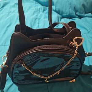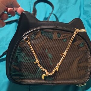 Black cat ITA Bag Pin Display Bag. Perfect for showcasing your pins. Clear front with removable pin display. Gold chain with heart accents. shoulder and hand strap
