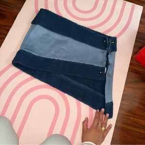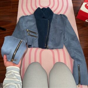 Chic blue leather jacket with shearling lining. Features zippered sleeves and front pockets. Cropped design for a trendy look. With matching skirt open on side, super sexy I just bought the wrong size.😭
