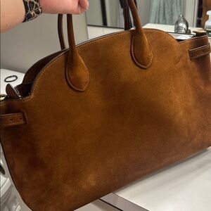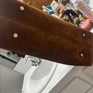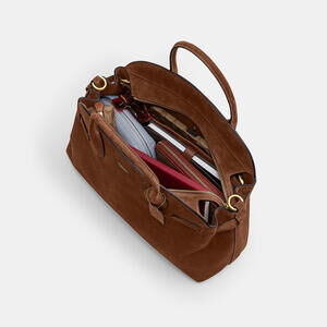 Suede and refined calf leather Inside snap pocket Inside lanyard with dogleash clip Zip-top closure fabric lining Handles with 4 1/2 drop Detachable strap with 21 1/2 drop for shoulder or crossbody wear Four protective feet at base Fits a 13 laptop 15 3/4 (L) x 11 1/2 (H) x 6 (W) Style No. CBN42