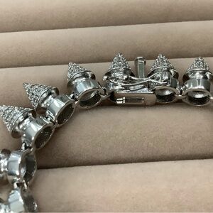 This silver pave bracelet is rhodium coated. Tree spikes with cubic zirconia stones in a pave setting wrap completely around the wrist.
