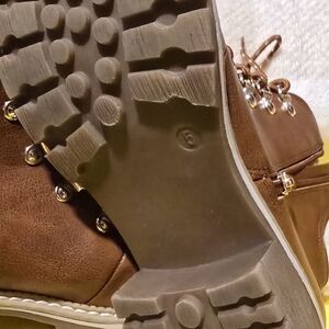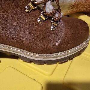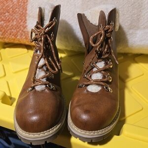 Stylish brown ankle boots with cozy shearling trim. Perfect for cold weather.