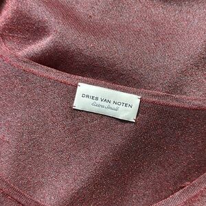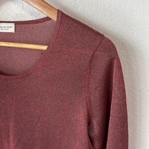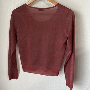 This sweater is very lightweight. It’s a bit of a metallic sheen, red color. There are a couple snags. Mostly just noticeable on the inside. Otherwise, gently used condition. Size XS.