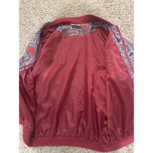 Vintage Alfred Dunner zip-front paisley bomber jacket in a rich jewel-tone red and teal colorway. Classic 80s/90s styling with ribbed collar, cuffs and hem. Fully lined for comfort and structure. Beautiful statement piece for retro, boho, cottagecore, or eclectic styling.
